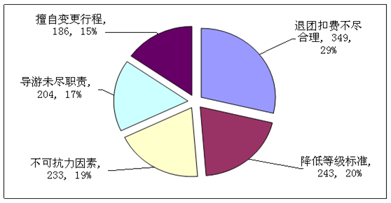 按投诉类别划分,投诉热点主要集中在:投诉旅行社拒签后退团不当扣费、降低等级标准、由于不可抗力因素引起投诉、擅自延误变更行程、导游未尽职责等问题上。数据显示,投诉旅行社在游客出国旅游被拒签后,退团扣费不尽合理349宗,占全部投诉的17.0%;因降低等级标准243宗,占全部投诉的11.8%;因不可抗力因素233宗,占全部投诉的11.3%;投诉导游未尽职责204宗,占全部投诉9.9%;因延误擅自变更行程186宗,占全部投诉的9.0%。