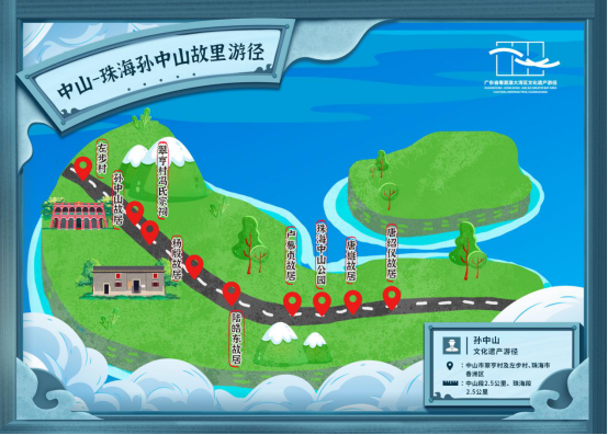 游径线路:左步村—孙中山故居—翠亨村冯氏宗祠—杨殷故居—陆皓东故居—卢慕贞故居—珠海中山公园—唐雄故居—唐绍仪故居