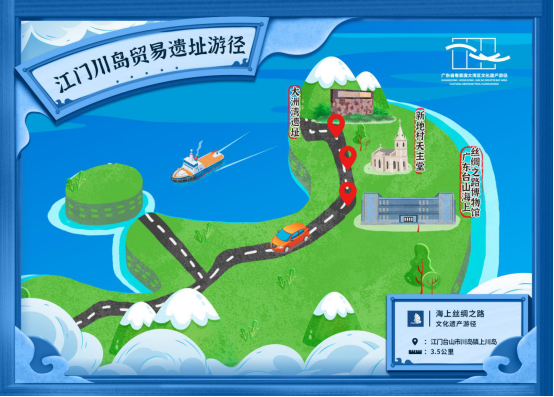 游径线路:(川岛镇大洲村委会大象山)—大洲湾遗址—新地村天主堂—(广东台山丝绸之路博物馆)