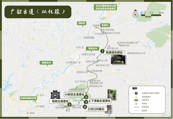 广韶古道(从化段)南起钱岗古村,北至温泉镇,全长45公里,是广州市周边最具历史文化内涵的古驿道。现保存较为完整的古道有钱岗古道、上下清幽古道、小蛇径古道等。据考证,从化历史上有水陆联运的驿道,陆路由从化古道起向南走水路流溪河古水道连入珠江,向北接陆路影古古道和莲麻古道,自南向北联通成为清代广州府与从化县之间的官道,是历史上粤港澳大湾区与周边地区乃至中原之间移民迁徙、商贸往来、文化传播的主要通道。