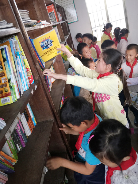在校长的带领下,志愿者们一下车就马不停蹄地前往学校的阅览室,把一箱箱图书拆包、整理、上架。在简单的揭幕仪式后,爱心阅览室开放了,孩子们迫不及待地寻找心仪的图书,水灵灵的眼睛里充满了对书中新鲜知识的好奇。据校长介绍,阅览室的书已经很久没有更新了,由于学校地理位置偏僻,以前很少有志愿者来这里,所以此次"书香暖山区"志愿者们的到来让他们尤为感激。