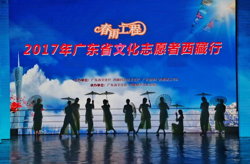 本次活动由广东省文化厅、西藏自治区文化厅、广东省第八批援藏工作队联合主办。50余名广东文化志愿者们以“大舞台”“大展台”“大讲堂”的形式,未来一周将在林芝地区举办4场文艺演出、1场展览、2场讲座及开展联谊交流等系列活动,为当地人民呈上文化大餐。