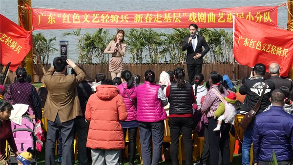 2018年2月6日下午至晚上,由广东粤剧院优秀中青年演员组成的“红色文艺轻骑兵”小分队来到广州市南沙东涌镇,一连开展了三场惠民演出活动。天为幕、地为台,一众粤剧演员与老百姓零距离接触,亲切交流,所到之处无不洋溢着欢乐祥和的气氛。