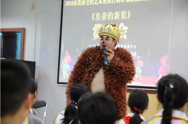 为了让居民更好的认识舞台艺术,了解剧目演员在舞台下的鲜活经历以及故事,主办方东莞市文化馆在每场剧目演出前都举办剧目赏析会,并邀请剧目《皇帝的新装》的主要演员及监制走进高埗镇西联小学与30多位教师、200多名学生现场互动。三位年轻的演员们带装参与赏析会,走进学校的瞬间,学生们就沸腾了,有欢呼的、尖叫的,还有些远处教室内的学生们拥挤到窗前争先观看,就仿佛看见了他们认知里最奇异的人物。互动经验丰富的演员们在进入会场的几分钟就让在座的200多名学生们都记住了他们的名字。在赏析会中西联中学师生们各个踊跃发言和演员们欢乐互动,交流编排儿童剧、音乐剧上的心得体验。
