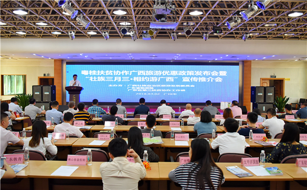4月2日,粤桂扶贫协作广西旅游优惠政策发布会暨“壮族三月三·相约游广西”宣传推介会在广东省旅游局举行。该项活动由广东省旅游局、广东省第二扶贫协作工作组、广西壮族自治区旅游发展委员会联合主办。两省旅游局(委)、相关市县旅游部门代表、媒体代表、两省旅行商和企业代表等近百人参加了本次推介会。