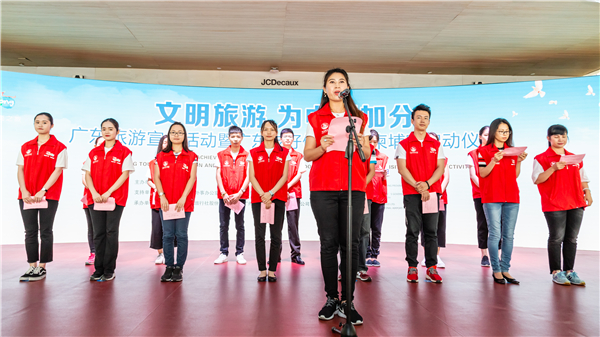仪式现场,旅游志愿者代表宣读《文明旅游 为中国加分 出行有礼倡议书》、与所有志愿者一起倡导做文明旅游践行者和宣传者,为提升我省文明旅游形象贡献力量。