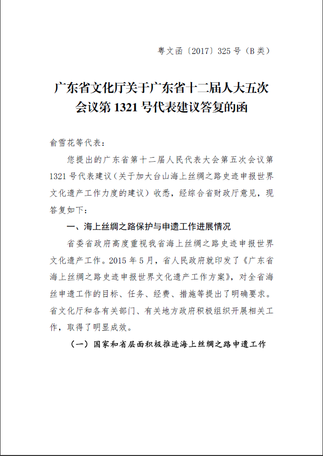 广东省文化厅关于广东省十二届人大五次会议第1321号代表建议答复的函