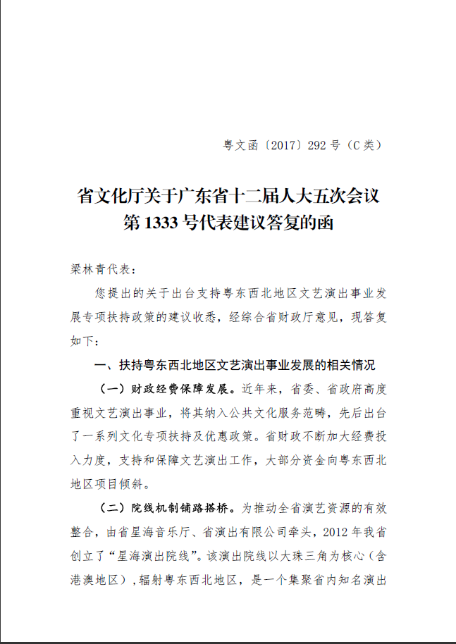 省文化厅关于广东省十二届人大五次会议第1333号代表建议答复的函