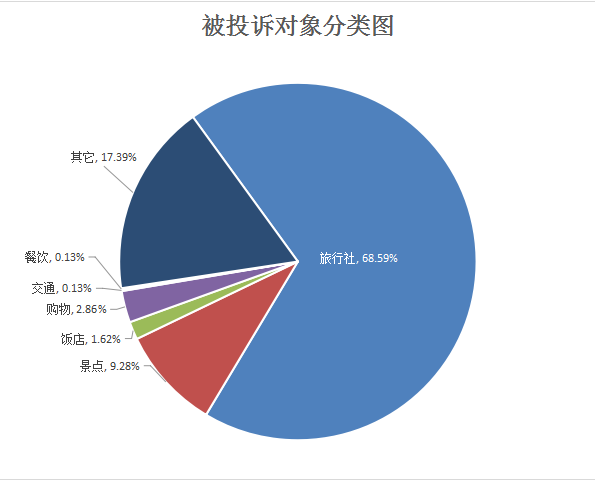从被投诉对象来分析,对旅行社的投诉仍是重点在线旅行社投诉上升。数据显示,第一季度,投诉旅行社1057宗,占投诉总数的68.59%,其中线下旅游投诉436宗,在线旅游投诉621宗。投诉景点143宗,占投诉总数的9.28%,投诉购物44宗,占投诉总数2.86%,投诉酒店25宗,占投诉总数1.62%,投诉交通2宗,占投诉总数0.13%,投诉餐饮2宗,占投诉总数0.13%,其它投诉268宗,占投诉总数17.39%。