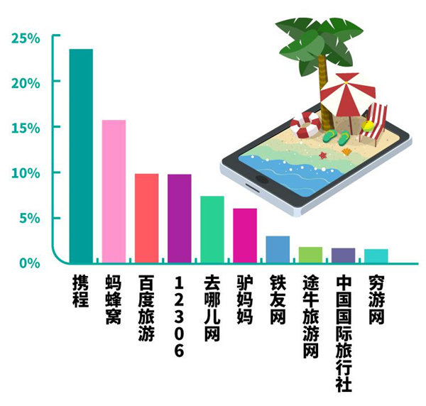 四、综合百度大数据、广东旅游产业大数据平台搜索数据,搜索广东旅游及相关产品的人群中,高消费群体占比达到44.9%,远高于全网占比24.7%,说明我省游客消费能力强、潜力大;搜索人群性别比例较为均衡,男女比例为50.2%:49.8%;80、90后仍为出游主力军,外出旅游成为他们孝敬老人、陪伴孩子的新方式。重视品质及文化体验,钟爱深度游、休闲游是他们的旅行特征。由于喜爱互动社区或社交网络中优质旅游视频及图文内容的,他们还愿意选择体验一些“网红”目的地、酒店、民宿。游客出发前习惯使用各种APP进行查询、预订,使用最多的是携程、蚂蜂窝、百度旅游、12306、去哪儿网、驴妈妈等。