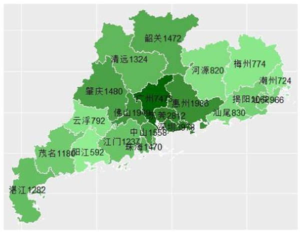 图1.6 广东乡村旅游出游游客分布(单位:万人次)
