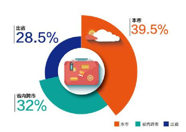 2018年上半年,我省乡村游接待游客人次3.37亿人次中,本市游客1.33亿人次,占比39.5%,省内跨市游客1.08亿人次,占比32.0%,省内游客合计占比71.5%,省外游客为0.96亿次,占比28.5%。