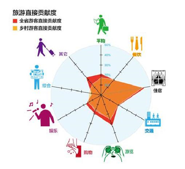 全省游客对泛消费行业直接贡献度达20.80%,乡村旅游游客的直接贡献度低于全省平均水平,为17.32%,其中乡村旅游游客吃、住、行、游、购、娱贡献度分别为20.15%、40.80、18.34%、25.24%、16.66%、14.37%,均低于游客平均水平。