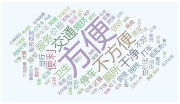 【卫生环境】评价主要针对公共厕所、环境卫生等方面,评价较差,评论词集中在脏死了、不干净、不卫生、臭等差评词;