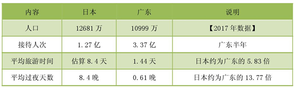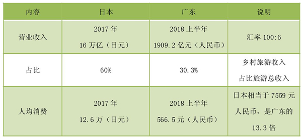 日本是乡村旅游的发源地,是世界乡村旅游最发达的国家之一,是各国乡村旅游发展的范本和标杆。广东、日本人口接近,人均土地面积少,乡村旅游都属于小农产业形态,旅游资源相似,因此,对标日本乡村旅游有强烈的借鉴意义。限于检索到的文献、数据有限,部分指标比较分析如下: