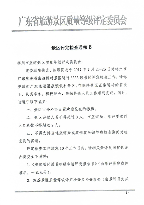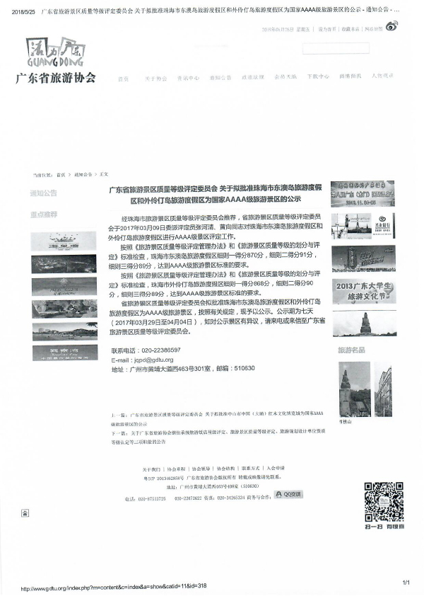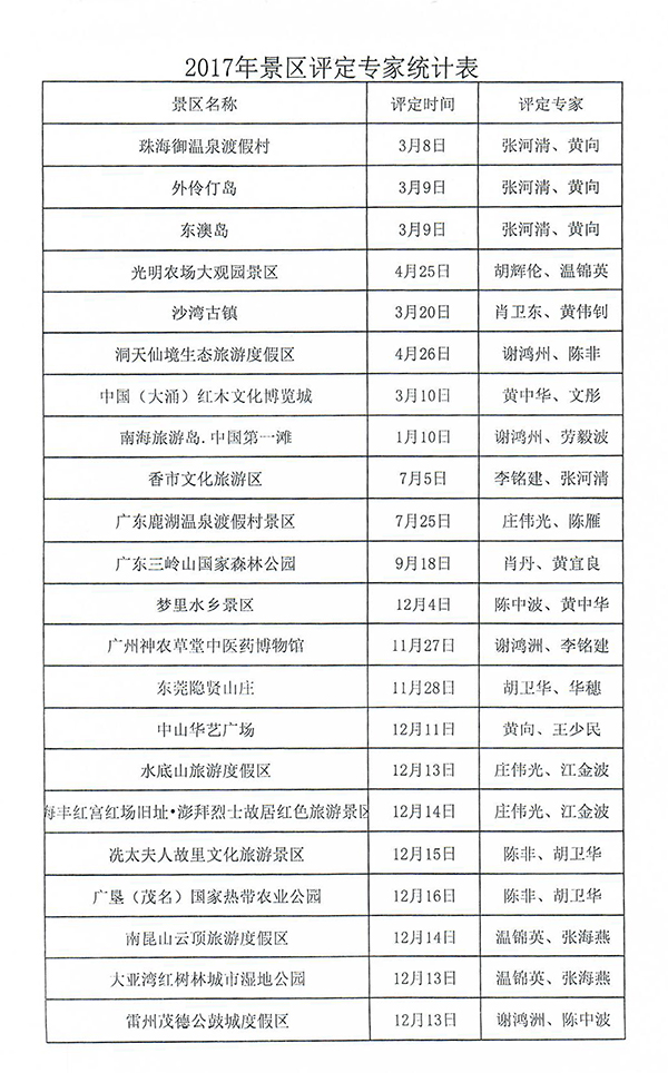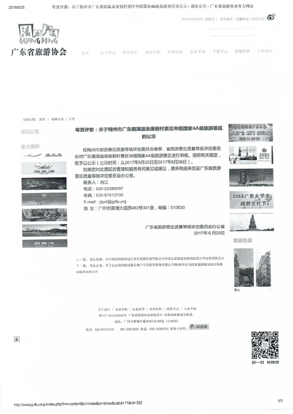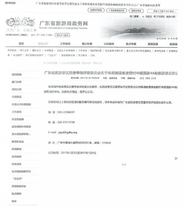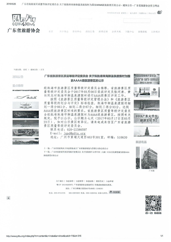 广东省旅游景区质量等级评定委员会关于珠海御温泉度假村申报国家4A级旅游景区的公示