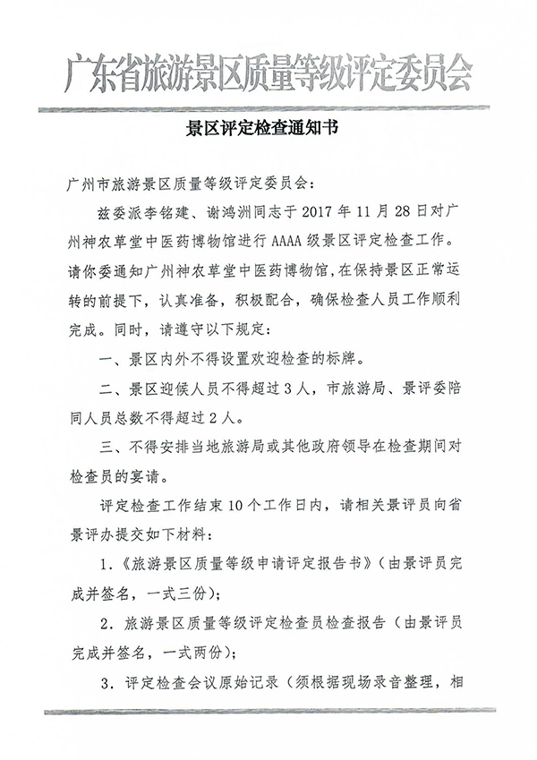 广东省旅游景区质量等级评定委员会关于拟批准广州神农草堂中医药博物馆为国家AAAA级旅游景区的公示