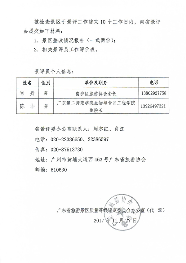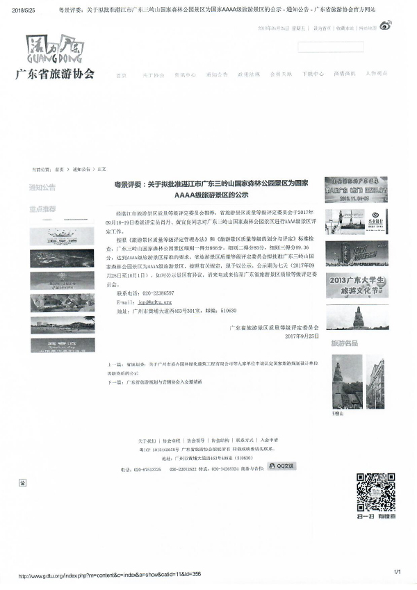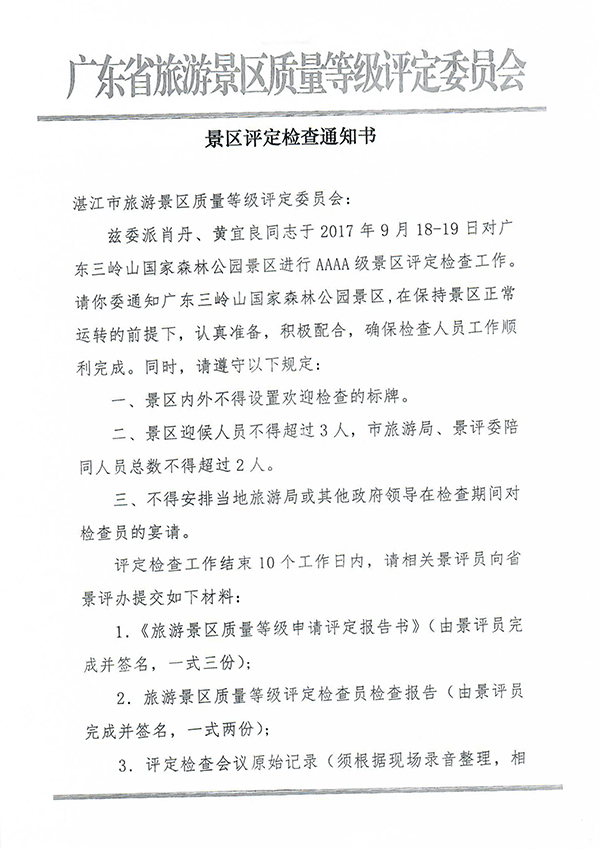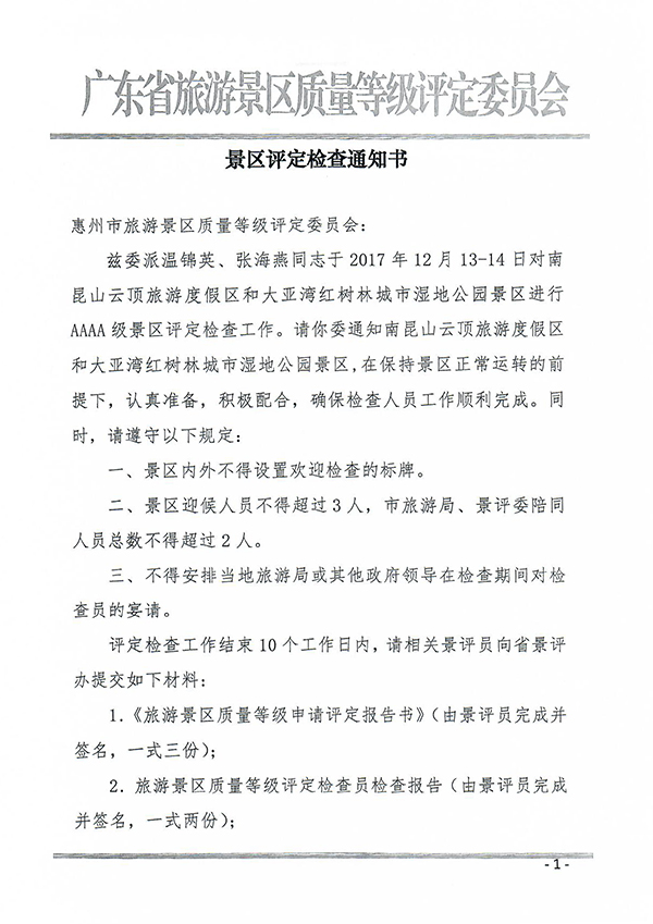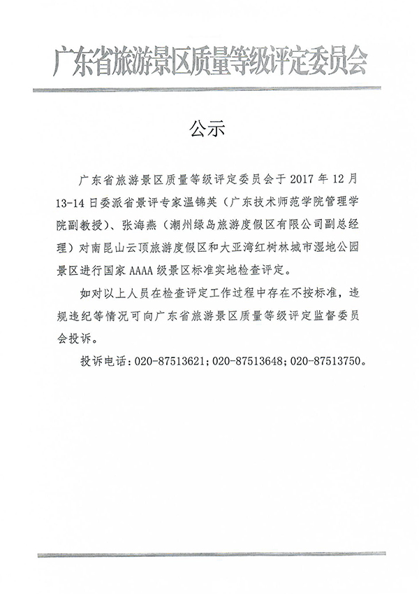广东省旅游景区质量等级评定委员会关于拟批准惠州市南昆山云顶旅游度假区和惠州市大亚湾红树林城市湿地公园景区为国家AAAA级旅游景区的公示