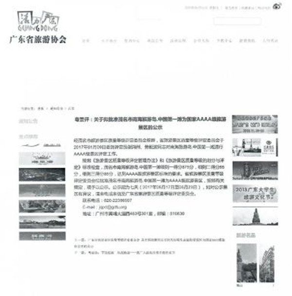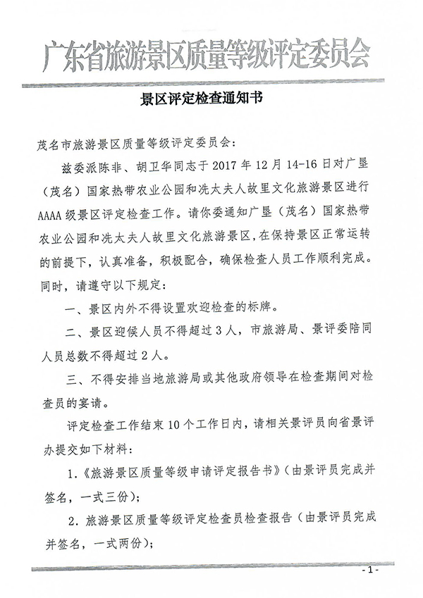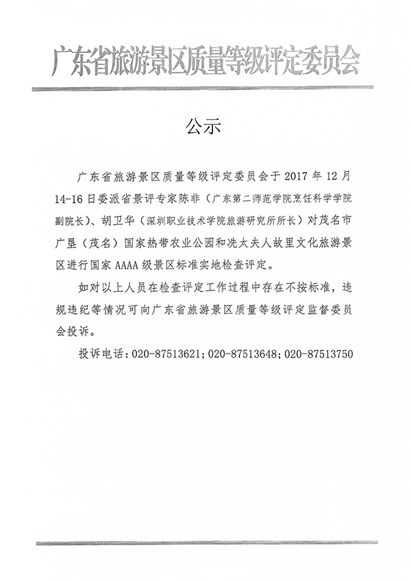 广东省旅游景区质量等级评定委员会关于拟批准茂名市冼太夫人故里文化旅游景区和茂名市广垦(茂名)国家热带农业公园为国家AAAA级旅游景区的公示