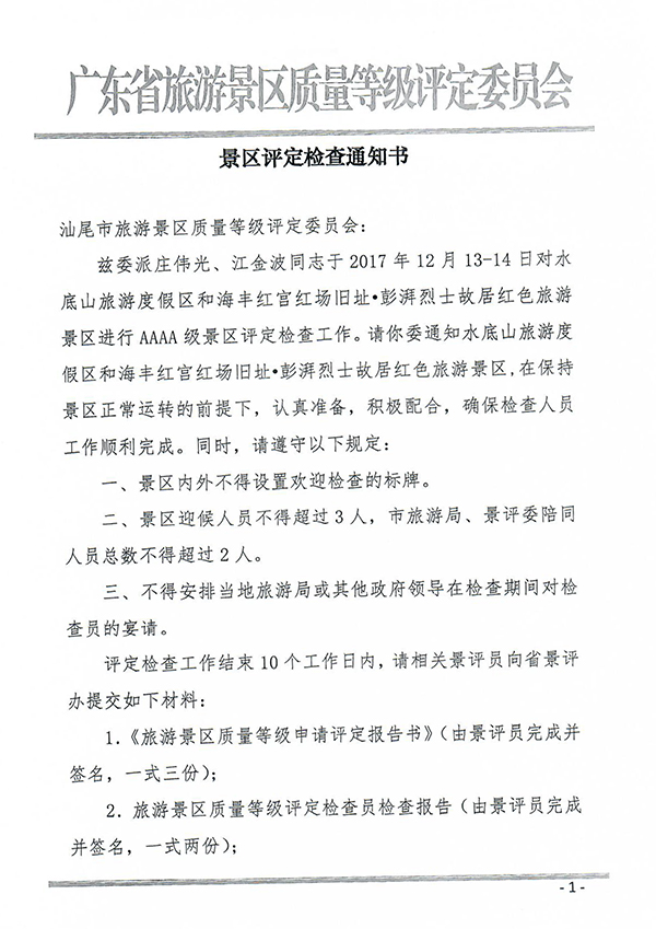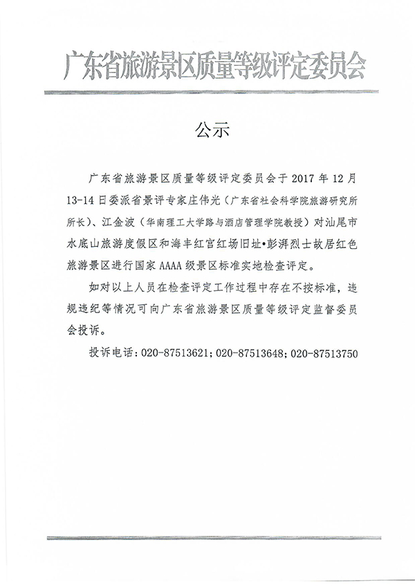 广东省旅游景区质量等级评定委员会关于拟批准汕尾市海丰红宫红场旧址·彭湃烈士故居红色旅游景区和汕尾市水底山旅游度假区为国家AAAA级旅游景区的公示