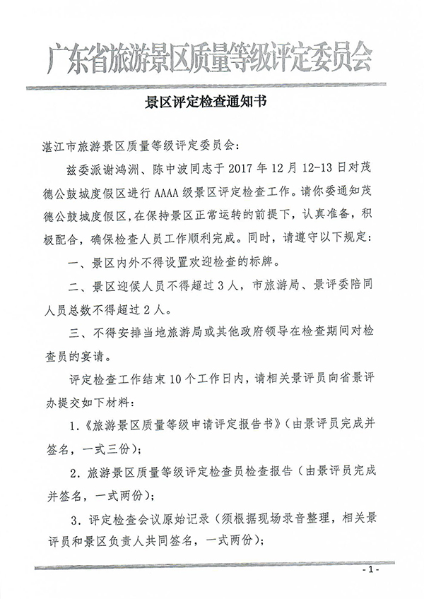 广东省旅游景区质量等级评定委员会关于拟批准湛江市茂德公鼓城景区为国家AAAA级旅游景区的公示