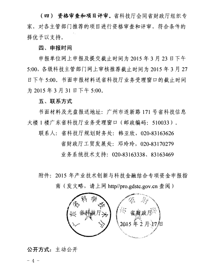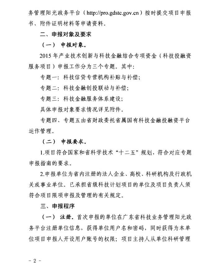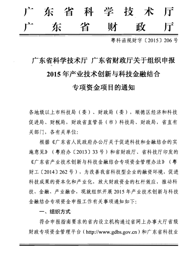 广东省科学技术厅 广东省财政厅关于组织申报2015年产业技术创新与科技金融结合专项资金项目的通知