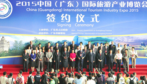 11日,2015中国(广东)国际旅游产业博览会在广州琶洲展馆隆重举行。副省长招玉芳、国家旅游局党组成员魏洪涛出席活动,与中外嘉宾共同见证了旅游项目签约。