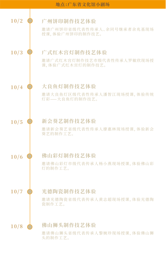 国庆期间,广东省非物质文化遗产保护中心将组织开展线下活动,8天共有7场非遗体验课堂,为广大市民群众提供有趣好玩的体验课程,让市民感受传统非遗的独特魅力。