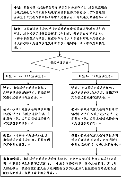 1、企业下载《旅游景区质量等级评定报告书》、准备申报材料,报送材料到所在地旅游景区评定机构; 2所在地旅游景区评定机构进行初审,并逐级报送报告; 3、评定。 国家3A、2A、1A级旅游景区由各市级评定委员会推荐,省级评定委员会组织专家评定,并报全国评定委员会备案。 国家5A、4A级等级评定工作由省级评定委员会组织专家以明查或暗访的形式进行省级审核,并形成专业调查报告,报全国评定委员会评定。 4、批复。国家3A、2A、1A级旅游景区由全省评定委员会进行批复,国家5A、4A级旅游景区由全国评定委员会进行批复。批复后由全国评定委员会统一授予A级等级证书和标志牌。 |