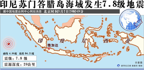 人民网北京3月3日电 (刘佳)据路透社2日报道,印尼苏门答腊岛西部海域发生里氏7.9级地震,目前,各大旅游机构经排查均表示震源距巴厘岛等主要旅游地较远,无明显影响,游客及游客家属无需恐慌。