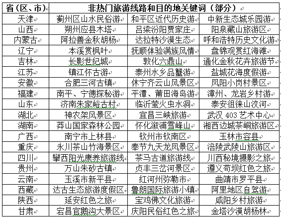 总有些美景在我们意想不到的地方。一些新兴的旅游线路和目的地未受到较多关注,部分热门的旅游线路和目的地进入相对淡季,在假日期间选择前往将大大提升旅游的品质,丰富旅行的内涵。为方便广大游客,部分省(市、区)旅游主管部门根据历年同期假日旅游情况,整理了一份非热门旅游线路和目的地关键词,以供参考。