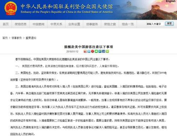 中新网1月15日电 据中国驻美国大使馆网站消息,春节假期临近,中国驻美国大使馆提醒拟赴美旅游的中国公民注意以下事项: