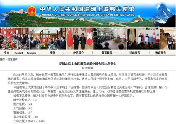 中国驻瑞士大使馆提醒计划赴瑞士山区滑雪、旅游的中国公民,在出行前密切关注当地天气情况,合理安排行程,尽量避免在天气恶劣时前往山区。做滑雪、远足等运动尤其注意安全,量力而行,切勿冒险前往雪场规定雪道以外的区域。