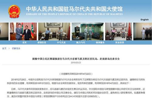中国侨网3月23日电 据中国驻马尔代夫大使馆网站消息,2018年2月28日,中国外交部和驻马尔代夫使馆根据马尔代夫安全局势发布了近期暂勿前往马尔代夫首都马累及附近居民岛、谨慎前往马其他旅游岛的安全提醒,有效期至2018年3月22日。根据马安全局势发展变化,现发布新的提醒,有效期至2018年4月22日,具体如下: