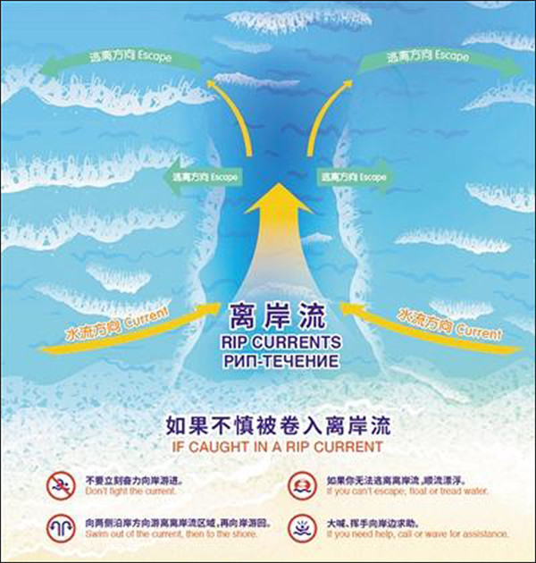 去年开始,在海南等重点滨海旅游区,游客已能见到“如果不慎被卷入离岸流”的安全提示标识。