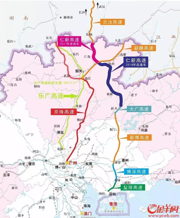 京珠北、乐广高速公路互为复线,珠三角一带前往湖南、湖北方向,两条线路均可选择。