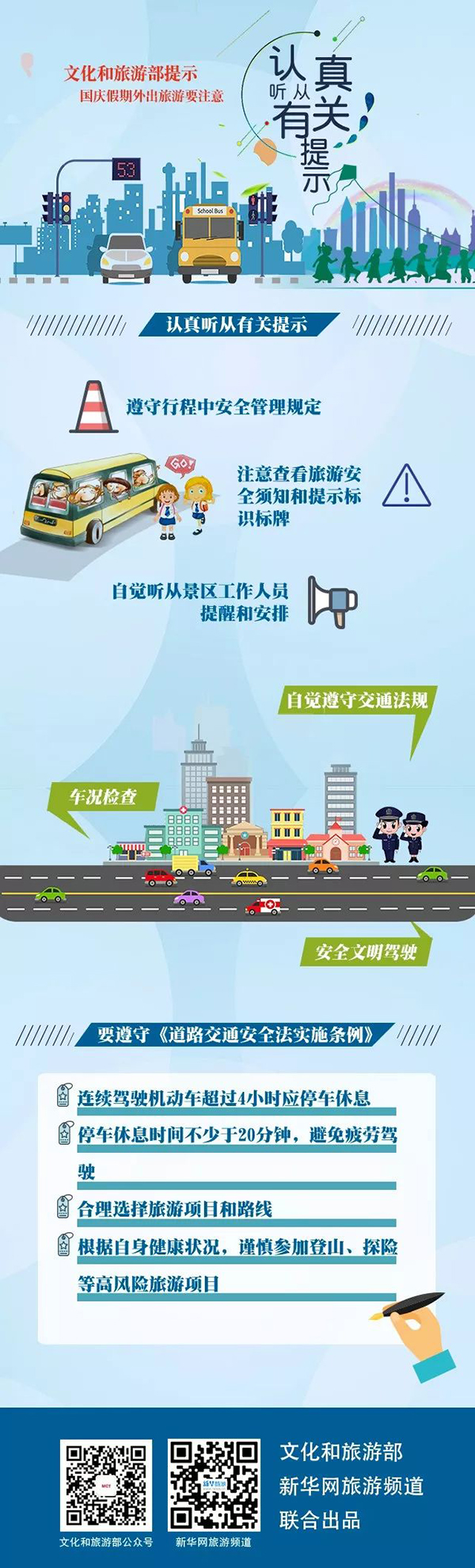 2018年国庆假期来临,各种旅游活动较为集中,广大群众出游意愿活跃。为此,文化和旅游部特别提示广大群众,外出旅游要认真听从有关提示。参加团队旅游,要遵守行程中安全管理规定,注意查看旅游安全须知和提示标识标牌,自觉听从景区工作人员提醒和安排,以免发生意外;自驾出游,行前要做好车况检查,自觉遵守交通法规,安全文明驾驶。远途出行,要遵守《道路交通安全法实施条例》有关“连续驾驶机动车超过4小时应停车休息,停车休息时间不少于20分钟”的规定,避免疲劳驾驶;自助游,要合理选择旅游项目和路线,根据自身健康状况,谨慎参加登山、探险等高风险旅游项目。