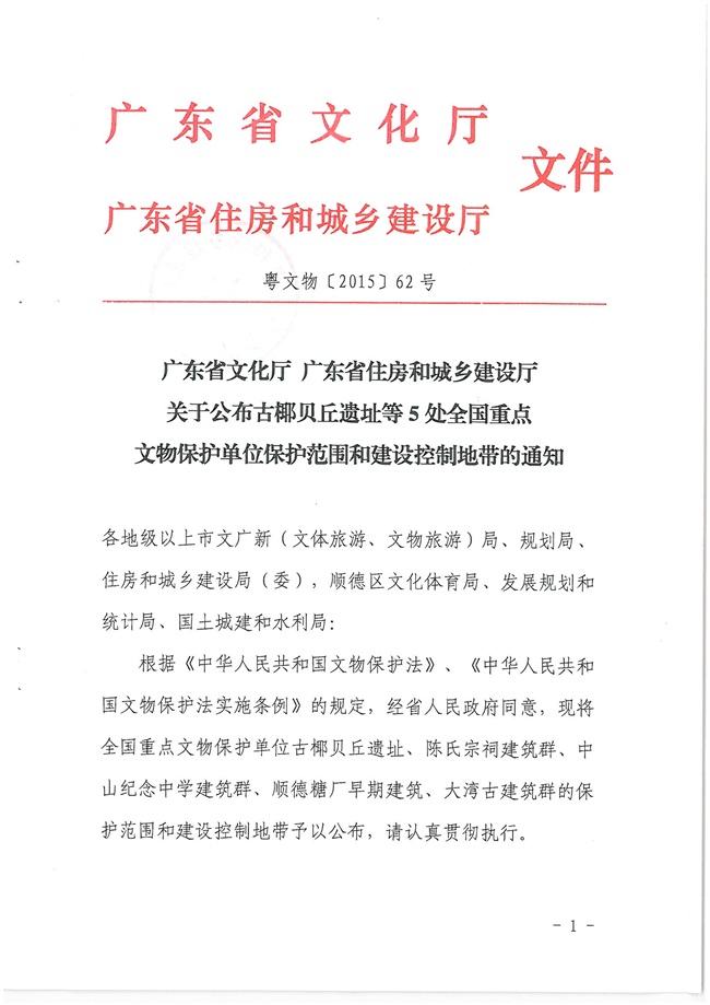 广东省文化厅 广东省住房和城乡建设厅关于公布古椰贝丘遗址等5处全国重点文物保护单位保护范围和建设控制地带的通知