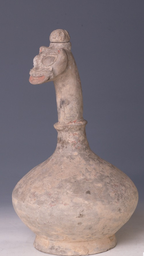 盖壶小口,细长颈,颈部有一凸弦纹,溜肩,圆腹,圈足外撇。圆盖凸起,上绘堆塑图案。兽头双目外鼓,额上有棱角外突,嘴部宽扁呈盆口形。盖壶彩绘大部分已剥落,胎质疏松,烧成温度不高。