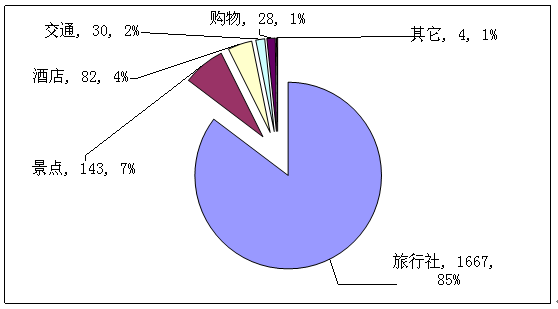 按投诉类别划分,投诉热点主要集中在:投诉旅行社拒签后退团不当扣费、降低等级标准、由于不可抗力因素引起投诉、擅自延误变更行程、导游未尽职责等问题上。数据显示,投诉旅行社在游客出国旅游被拒签后,退团扣费不尽合理349宗,占全部投诉的17.0%;因降低等级标准243宗,占全部投诉的11.8%;因不可抗力因素233宗,占全部投诉的11.3%;投诉导游未尽职责204宗,占全部投诉9.9%;因延误擅自变更行程186宗,占全部投诉的9.0%。