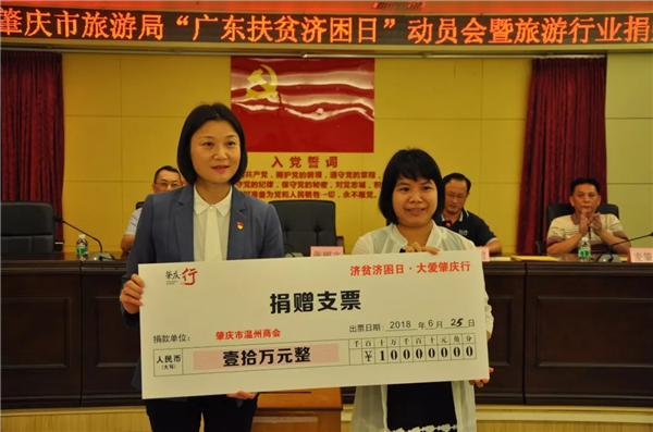 会上,张丽文局长、扶贫工作分管领导麦肇奎代表旅游局分别接受了肇庆温州商会、广东德诚科教有限公司(广东蓝天旅行社有限公司)、肇庆超越体育发展有限公司、肇庆融纳广告文化传播有限公司、肇庆国际大酒店、中国国旅(广东肇庆)国际旅行社有限公司、渔民新村海鲜大酒楼、皇中皇裹蒸粽有限公司的认捐支票。随后肇庆星酒店、星湖大酒店等企业现场纷纷慷慨解囊,为扶贫济困献一份力。