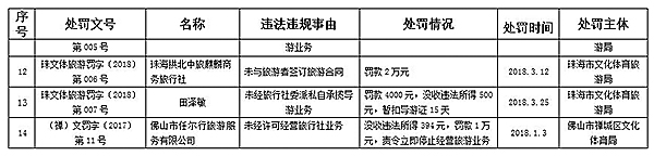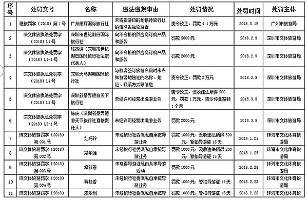 2018年第一季度,全省各级旅游主管部门共查处涉旅案件14宗,涉及6家经营旅游业务的企业和8名旅游从业人员。经研究,我局决定对以上企业和个人违法违规经营行为纳入旅游经营不良信息进行公示,公示有效时间1年(自2018年4月13日--2019年4月13日)。