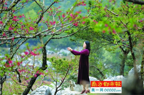 河源市连平县上坪镇桃花盛开,游人拍照留影。南都记者 吴进 摄